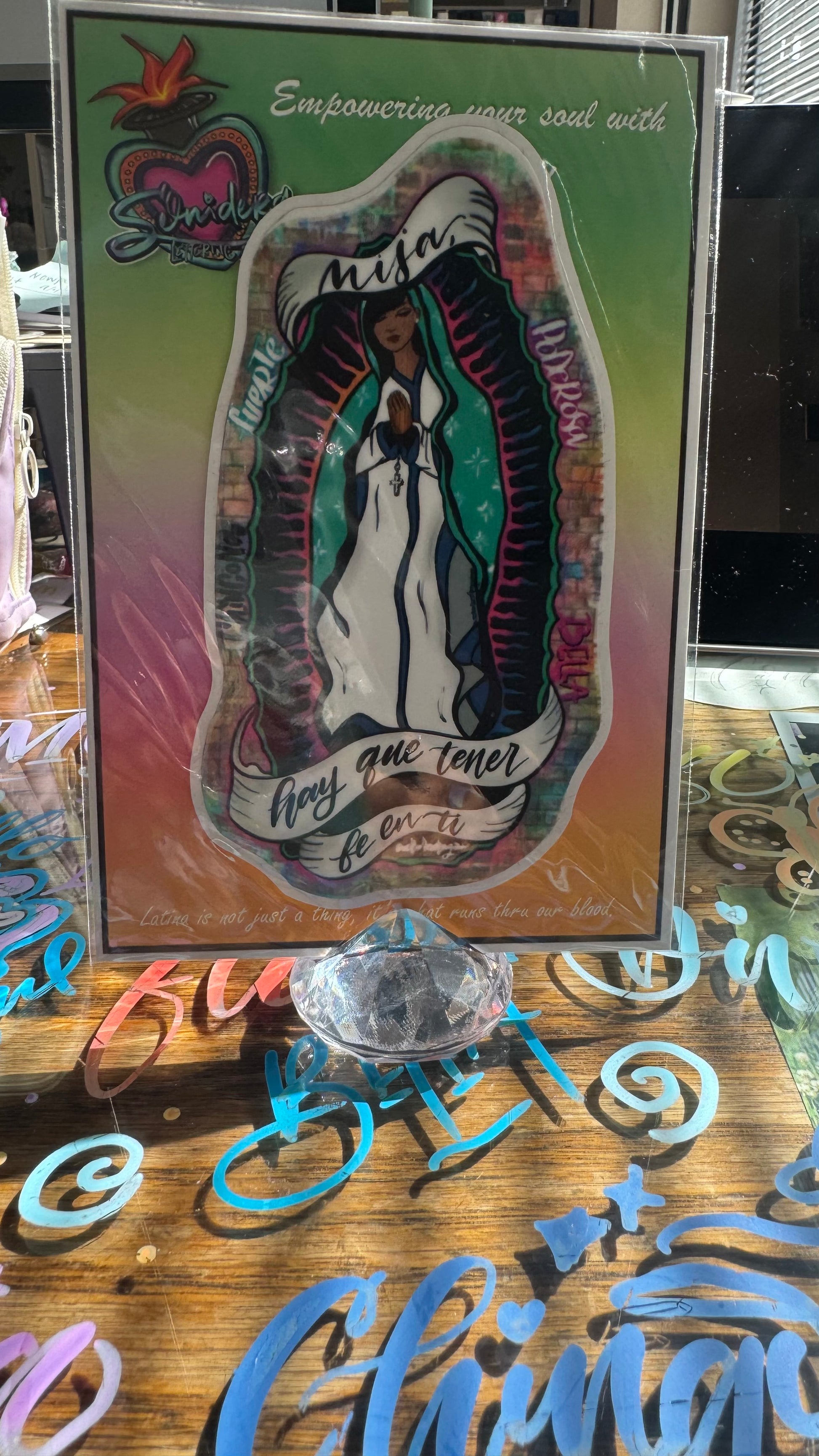 This striking 5-inch diecut features original artwork of the Virgin Mary rendered in araredragon style. Created as a bold homage to the artist’s father, it embodies themes of empowerment and self-love, making a powerful statement wherever it's displayed. Perfect for those who embrace courage and personal strength.